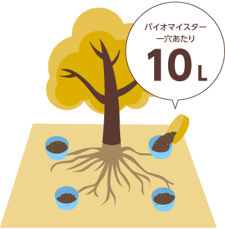樹木の根域土壌に直径30cm深さ60cmの穴を複数個あけ、固くなった土を取り出す。穴をあける場所は、細根が発生しやすい、枝張りの先あたりです。その後、掘り上げた土または新しい土にバイオマイスターを一穴あたり10L程度加え、埋め戻します。